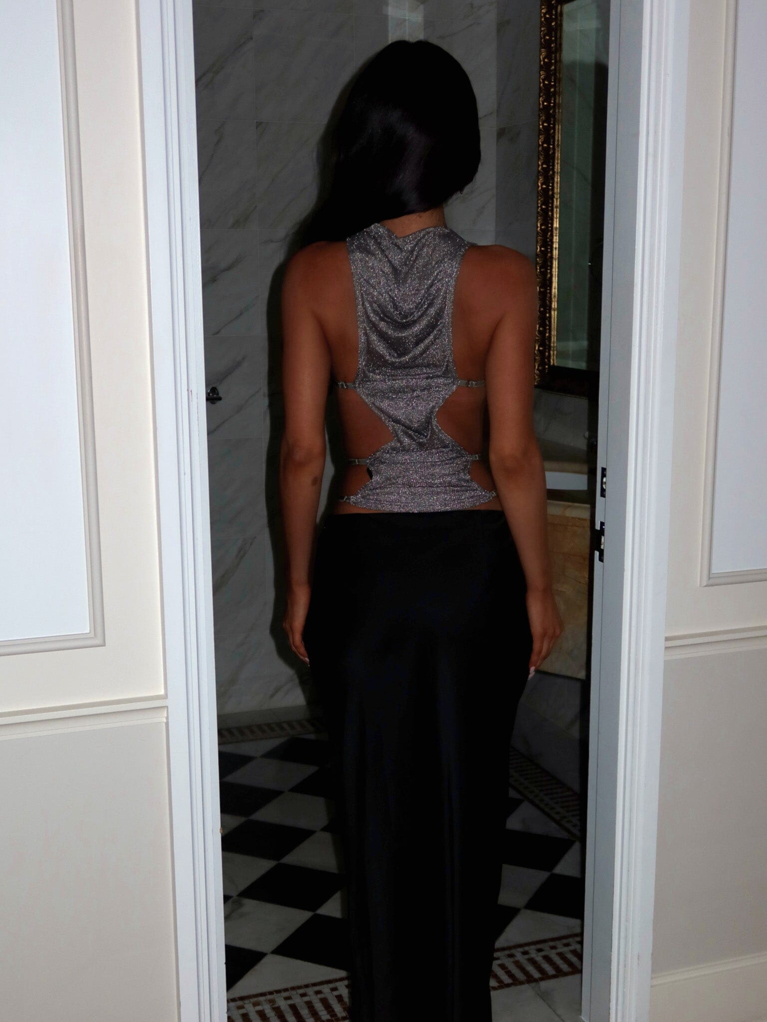 This sparkly sheer top features a high neckline and a ruched bodice, creating a textured look with an edge. Designed with eye-catching chain details on the sides and a backless silhouette, it offers a sultry twist on a classic shape.