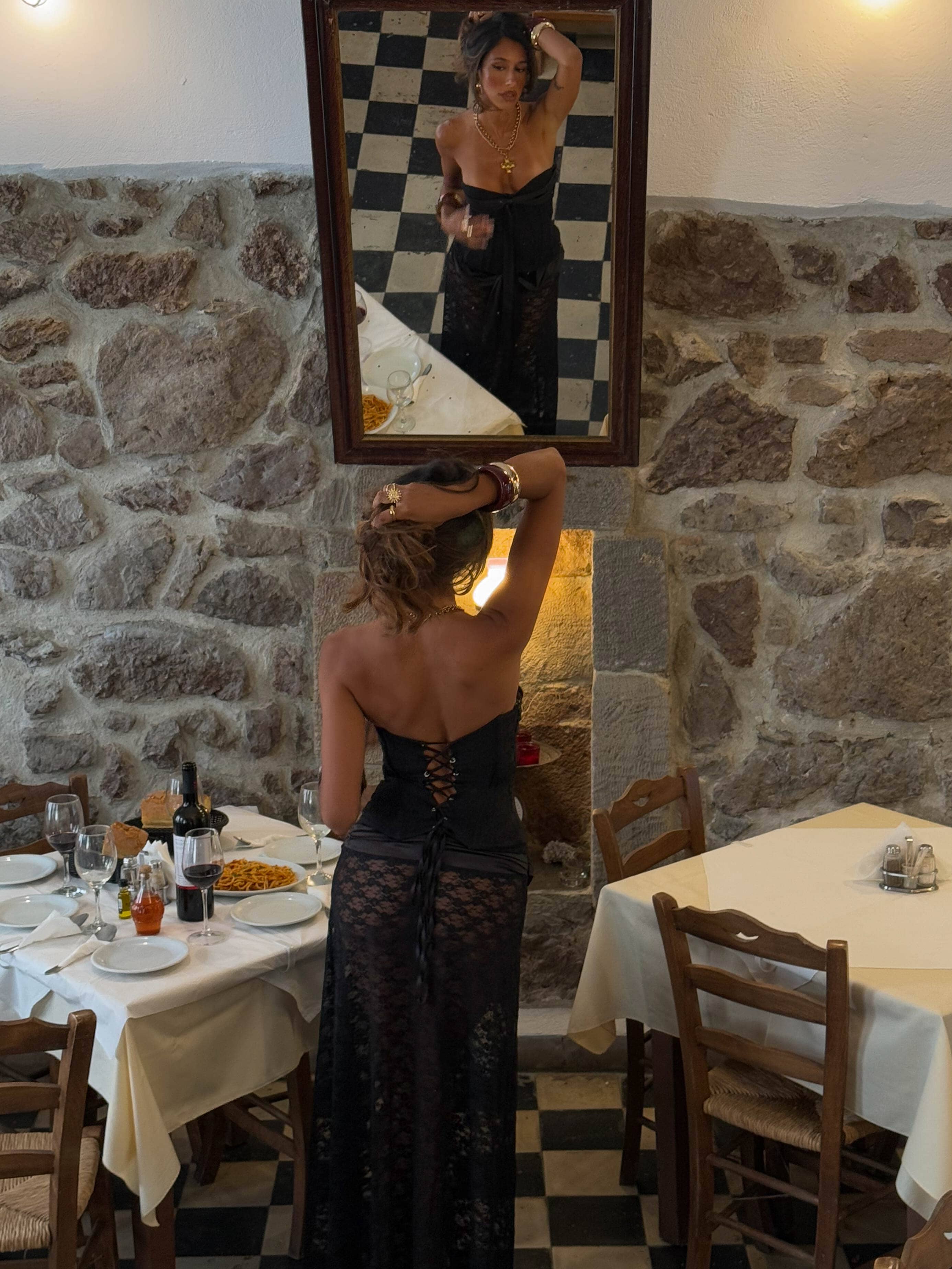 Amora features a luxe satin bust and sheer lace bodice, this corset-style top is fully lined in power mesh for added support and shape. With internal boning to sculpt your figure and a lace-up back for an adjustable fit, it blends romantic textures with a bold, confident edge.