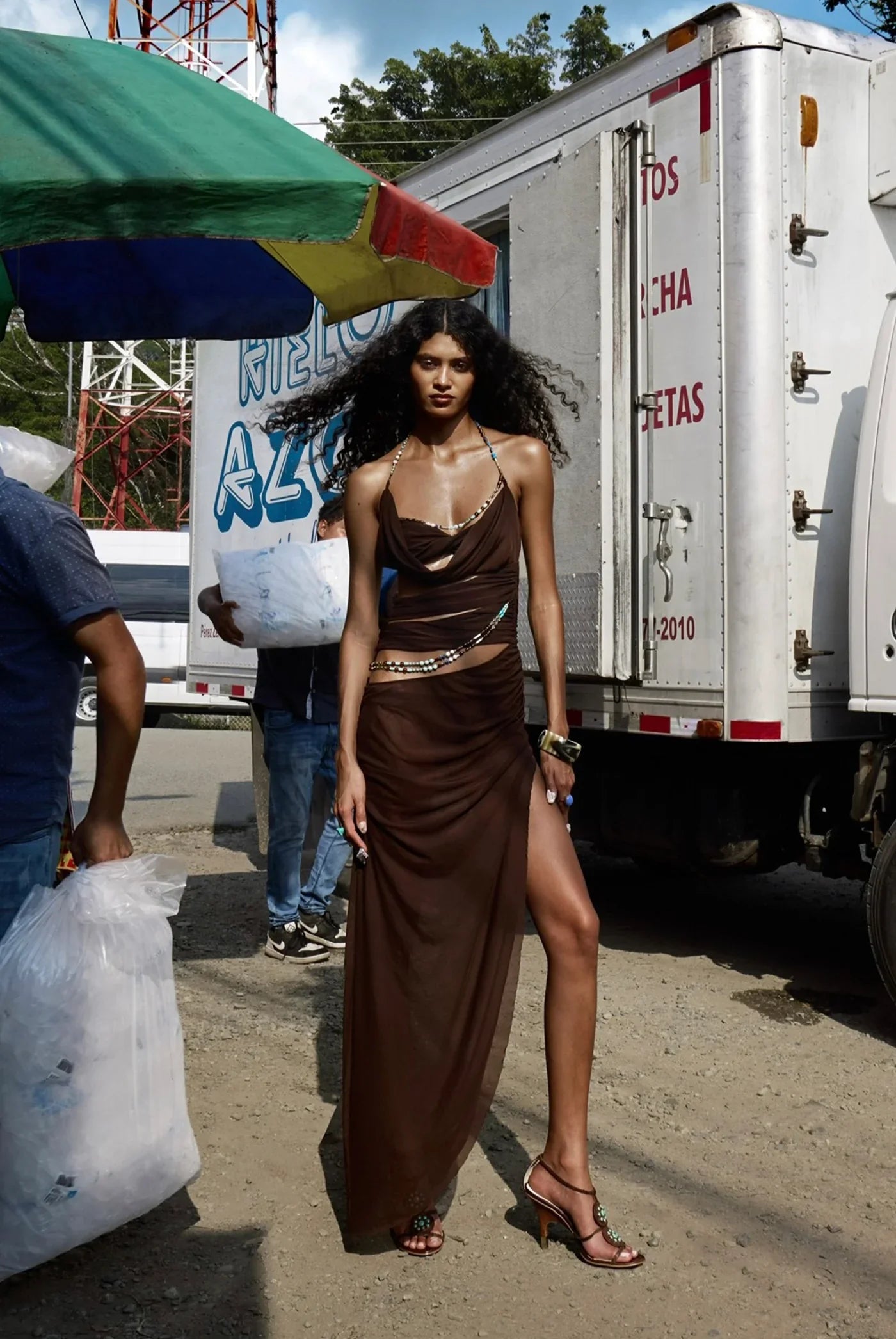 Draped mesh maxi dress with beaded trims.