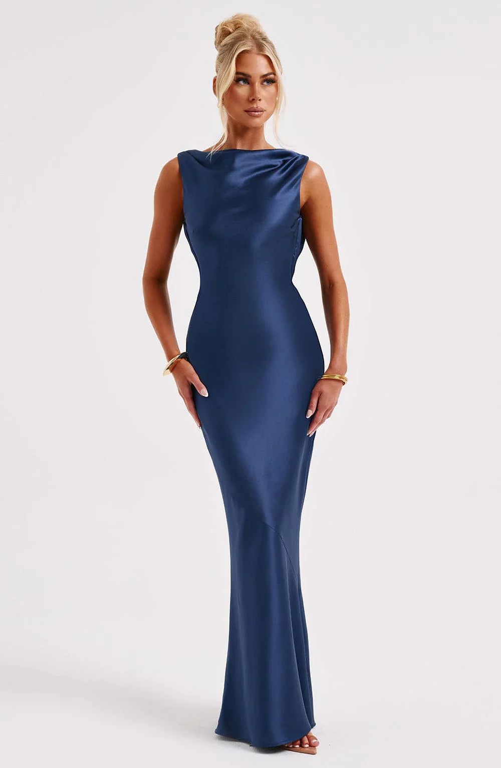 YOU are the moment in the Azuri maxi, a dreamy maxi dress made from bias cut satin which drapes beautifully and hugs the body in all the right places. With a modern high neck and fluid skirt, this design is complete with a showstopping cut out back.