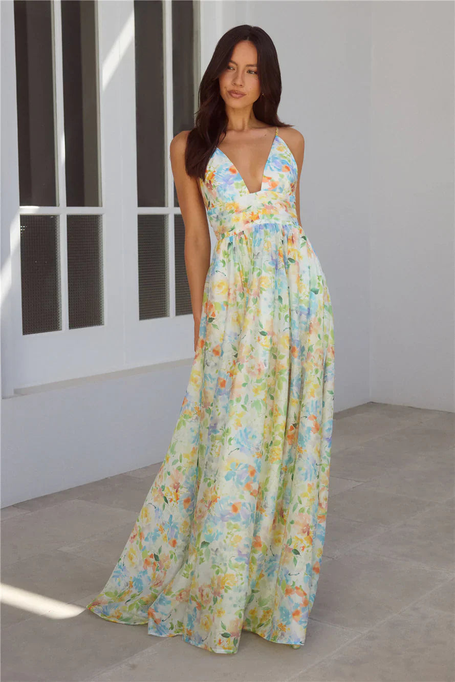 The Buttercup Fields Maxi Dress features a flattering V-neckline and a flowy skirt that moves beautifully with every step. A pleated waist adds a touch of shape and charm, making it the perfect pick for sun-filled days or dreamy afternoons. Style with heels.