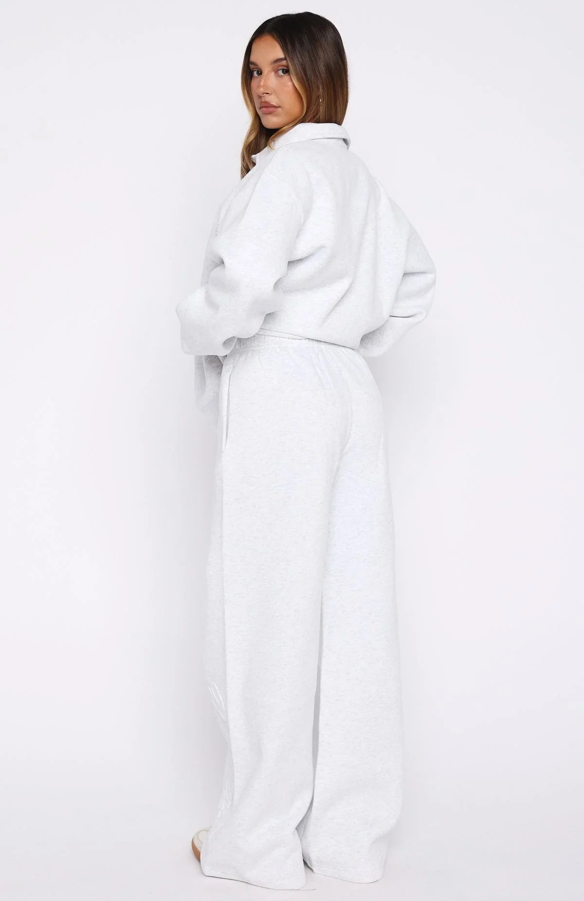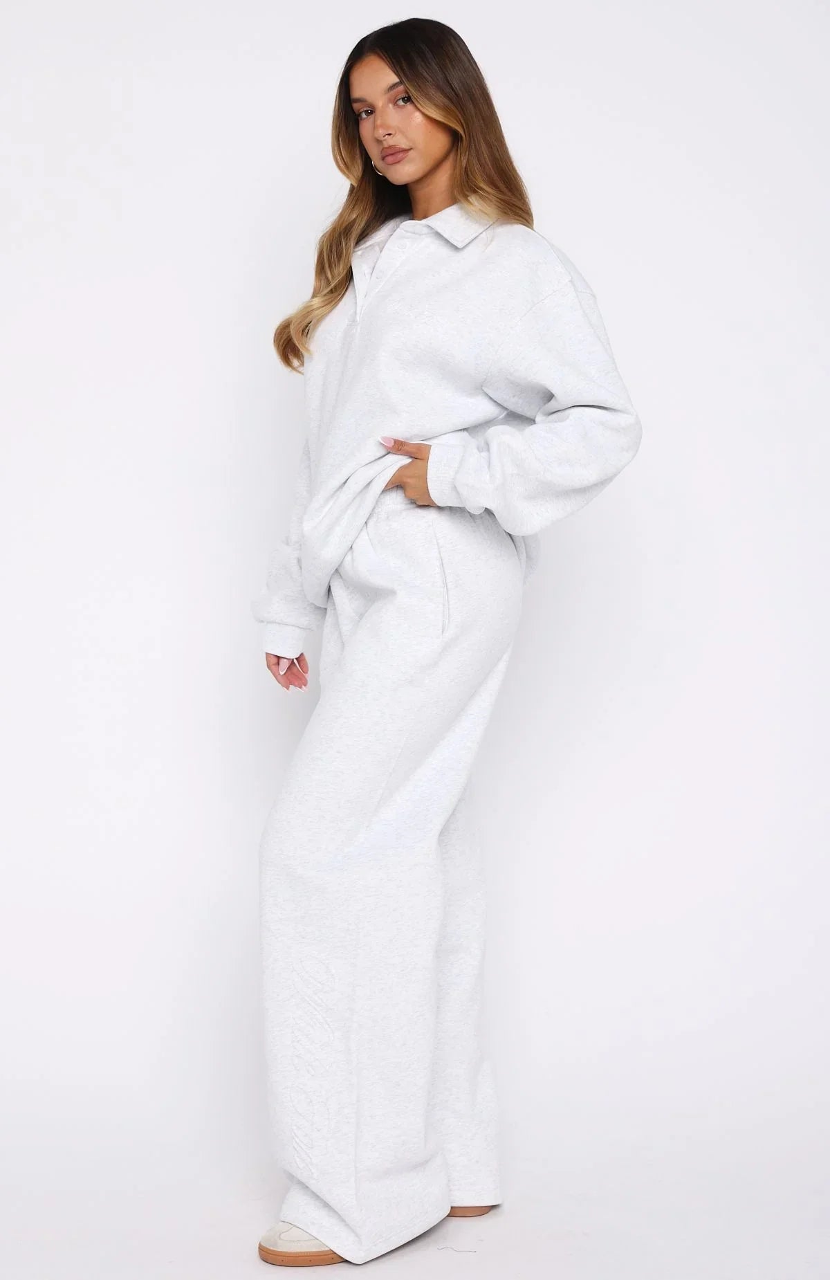The Stay Lifted Wide Leg Sweatpants in Grey Marle combine comfort and style effortlessly. Crafted from a soft fleece interior, these sweatpants feature an elasticated waistband with an internal drawstring, wide-leg silhouette, oversized fit, and side hip pockets. The embossed White Fox logo along the pant side adds subtle flair. Style with the matching Chill Moves Oversized Henley Sweater Grey Marle.
