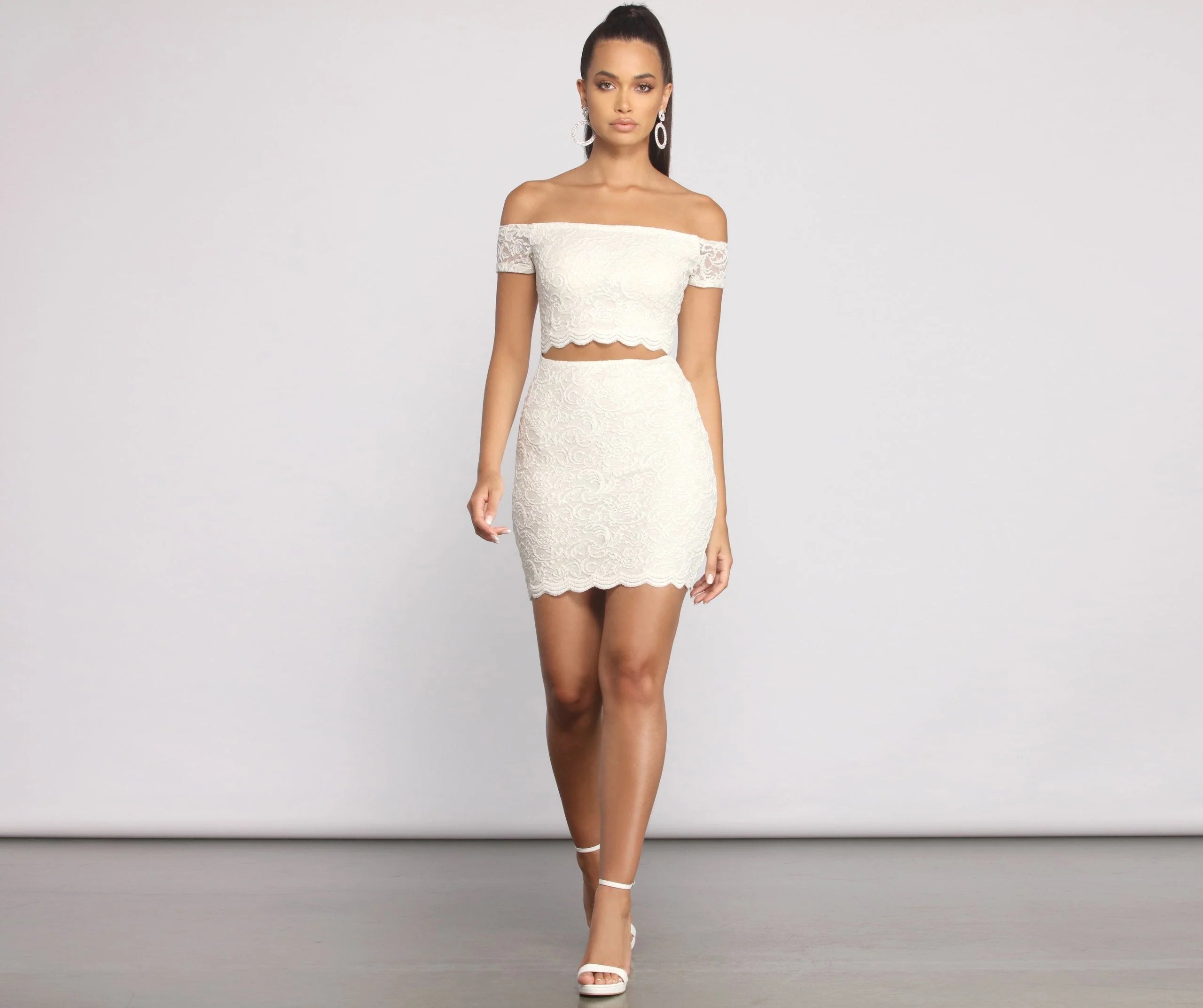 Add a touch of classic glam to your look with this chic mini dress. It features an off the shoulder square neckline, short sleeves, a front waist cut out with a scalloped hem, and a short, form hugging fit. The dress is composed of a sheer glitter lace fabric with a knit lining. Glitter may transfer.