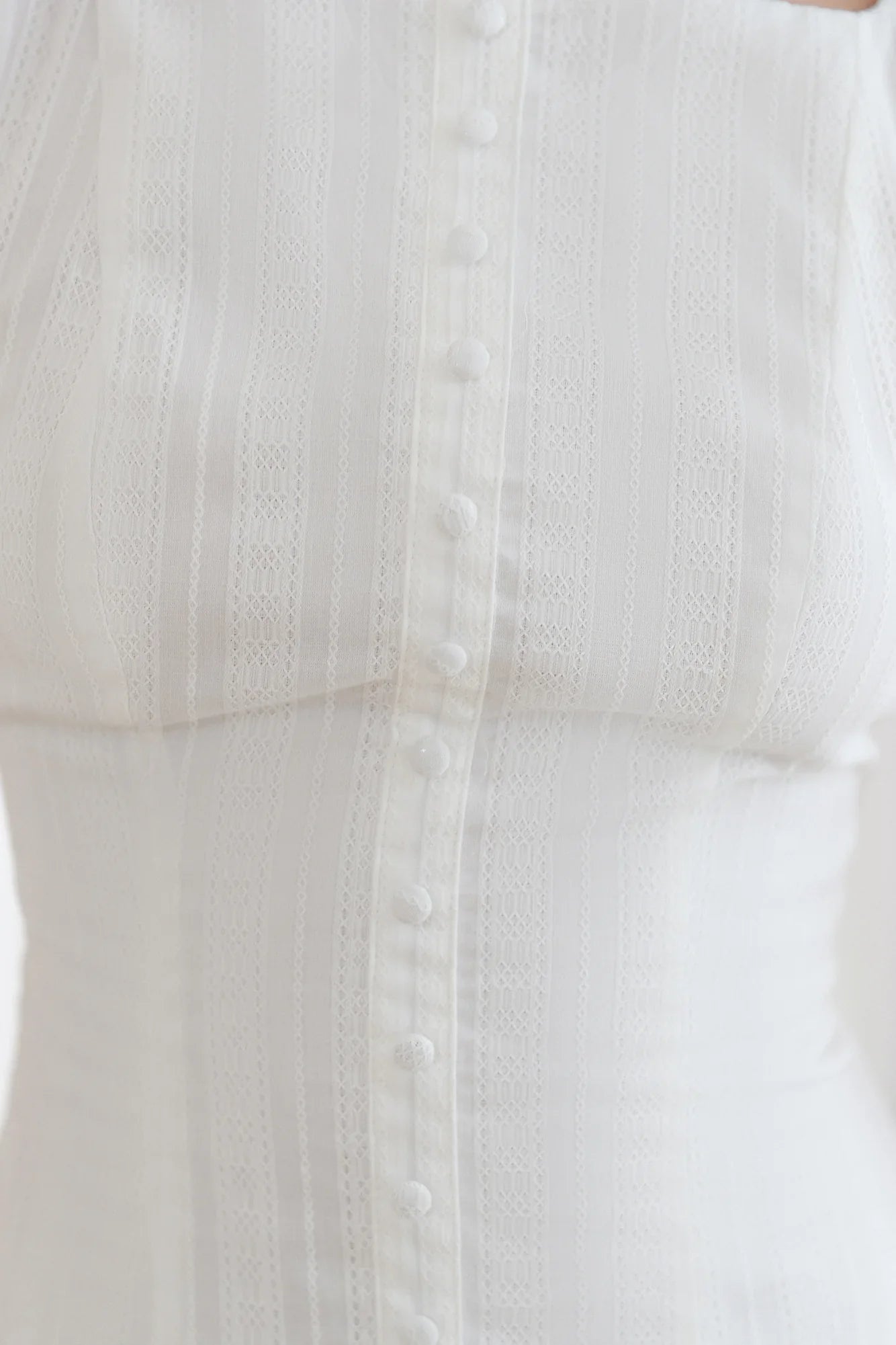Wander in style with the Dainty Style Mini Dress in White—a dreamy travel companion for sun-soaked getaways and city strolls. Featuring a charming faux button front, a playful bubble hem, and a comfy elastic back, this dress is made for effortless elegance on the go. Pair it with sandals for daytime exploring or dress it up for a romantic evening under the stars!