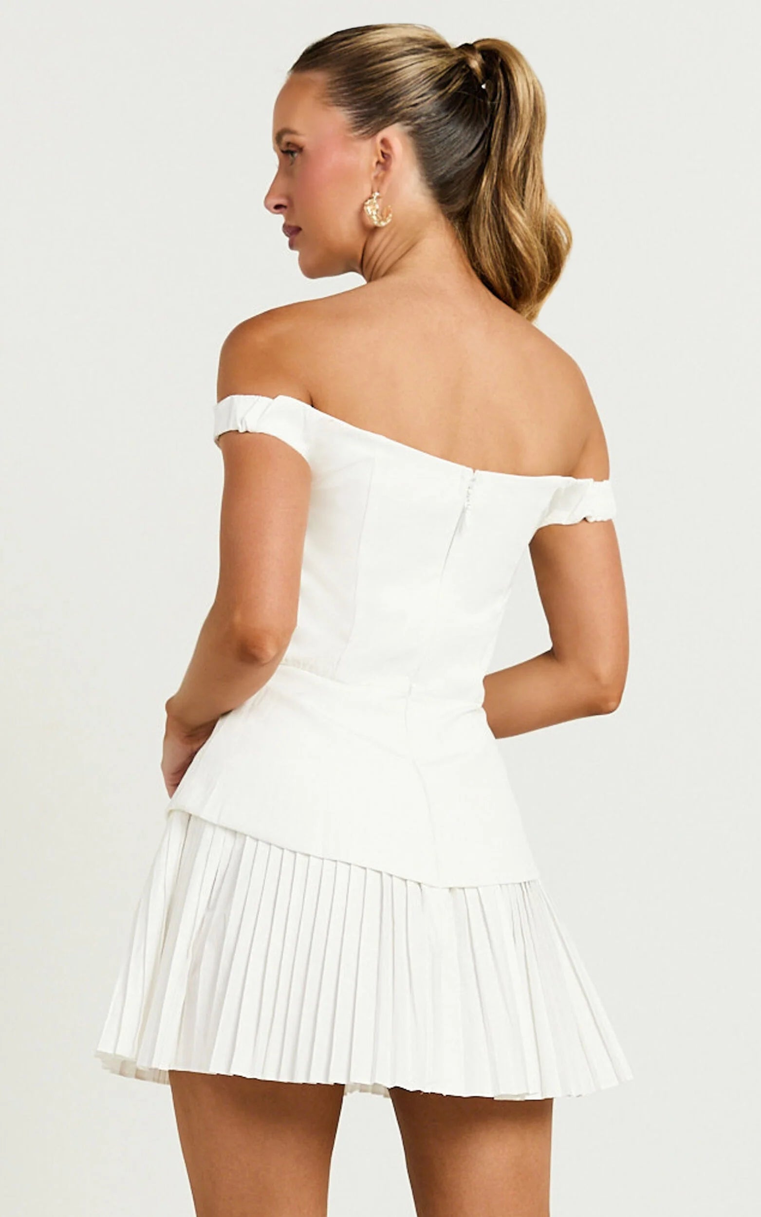 Unleash the timeless elegance and charm with the Izara Mini Dress - a versatile piece that promises to be the crowning jewel in your wardrobe. Crafted in an eye-catching off-white, this off-the-shoulder, pleated sensation is designed to celebrate you and your unique style, every time you slip it on. Whether it's a sun-kissed party day or a spontaneous evening out, this strapless, fit & flare treasure encapsulates the essence of effortless chic.Product Details:Zips, Inner LiningFit & Flare DressCotton, PolyesterOff The ShoulderParty Day UseMini LengthStrapless SleeveSize and FitSize S / 8 length: 65cm / 25.59inMaterial and CareMain Fabric: 65% Polyester, 35% Cotton Lining: 97% Polyester, 3% SpandexNo Stretch