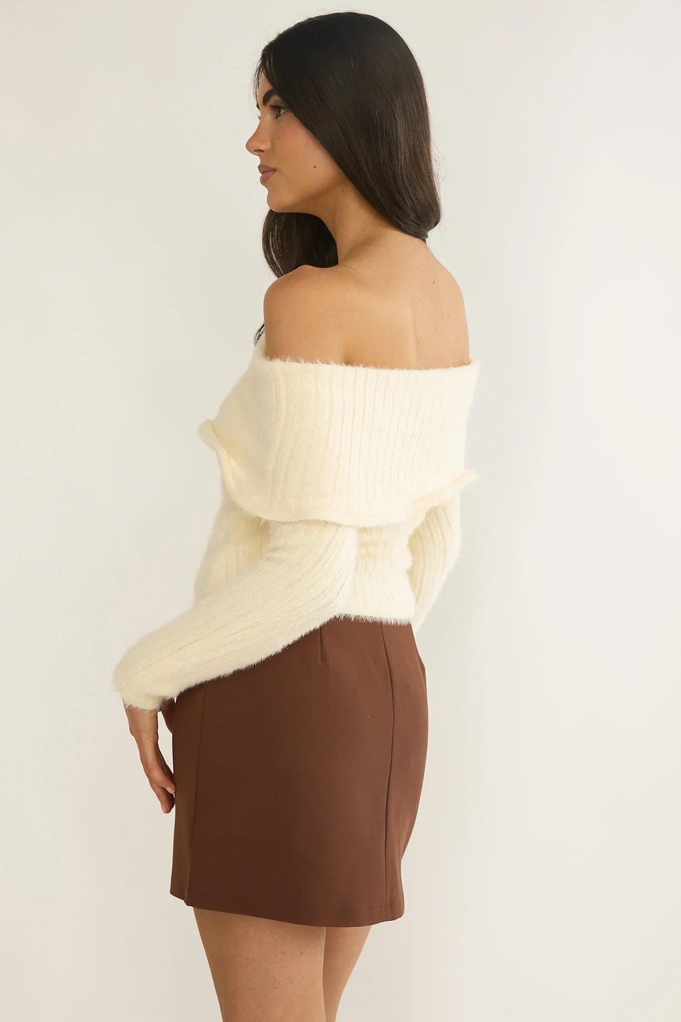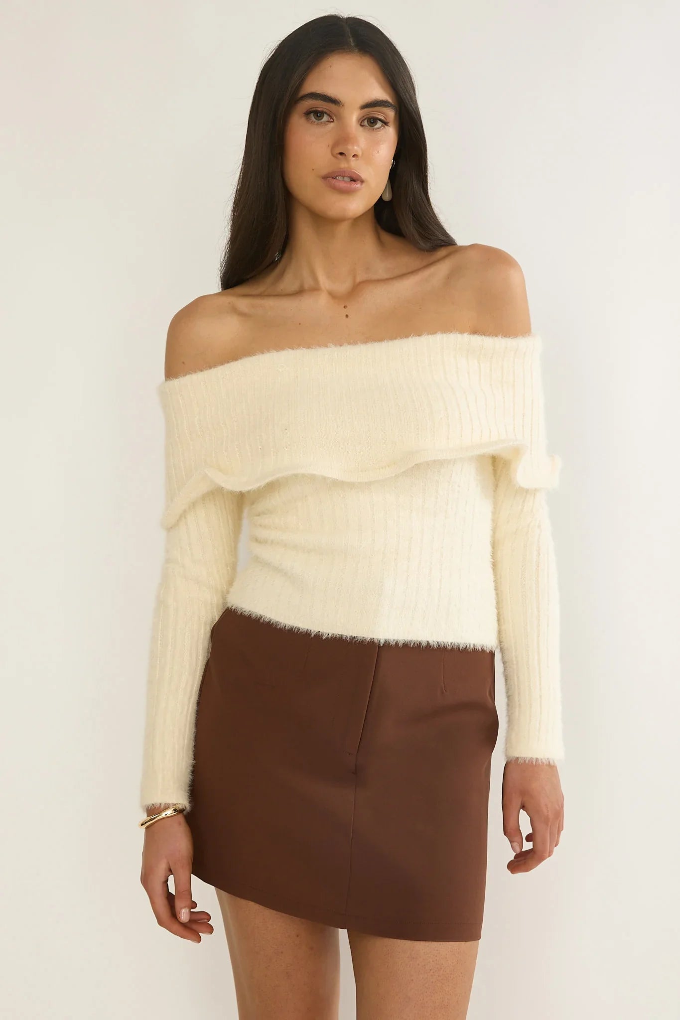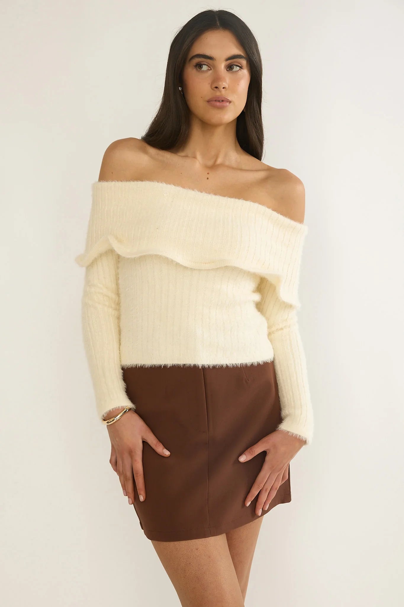 Hello, gorgeous! You will turn heads in our pretty Orielle top. It features a fuzzy knit and off-shoulder design and is perfect for coffee dates with your girls. Team it with a mini skirt and boots for a cute look.