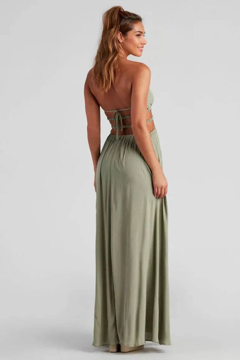 Pack this flowy lightweight maxi dress in your carry-on as you jet set off on vacay! It features a sleeveless V-neckline, halter spaghetti straps, a smocked high waist with chic cutouts leading to an open strappy back, and a floor-length maxi silhouette with a side slit and a relaxed fit. Style with espadrille sandals.