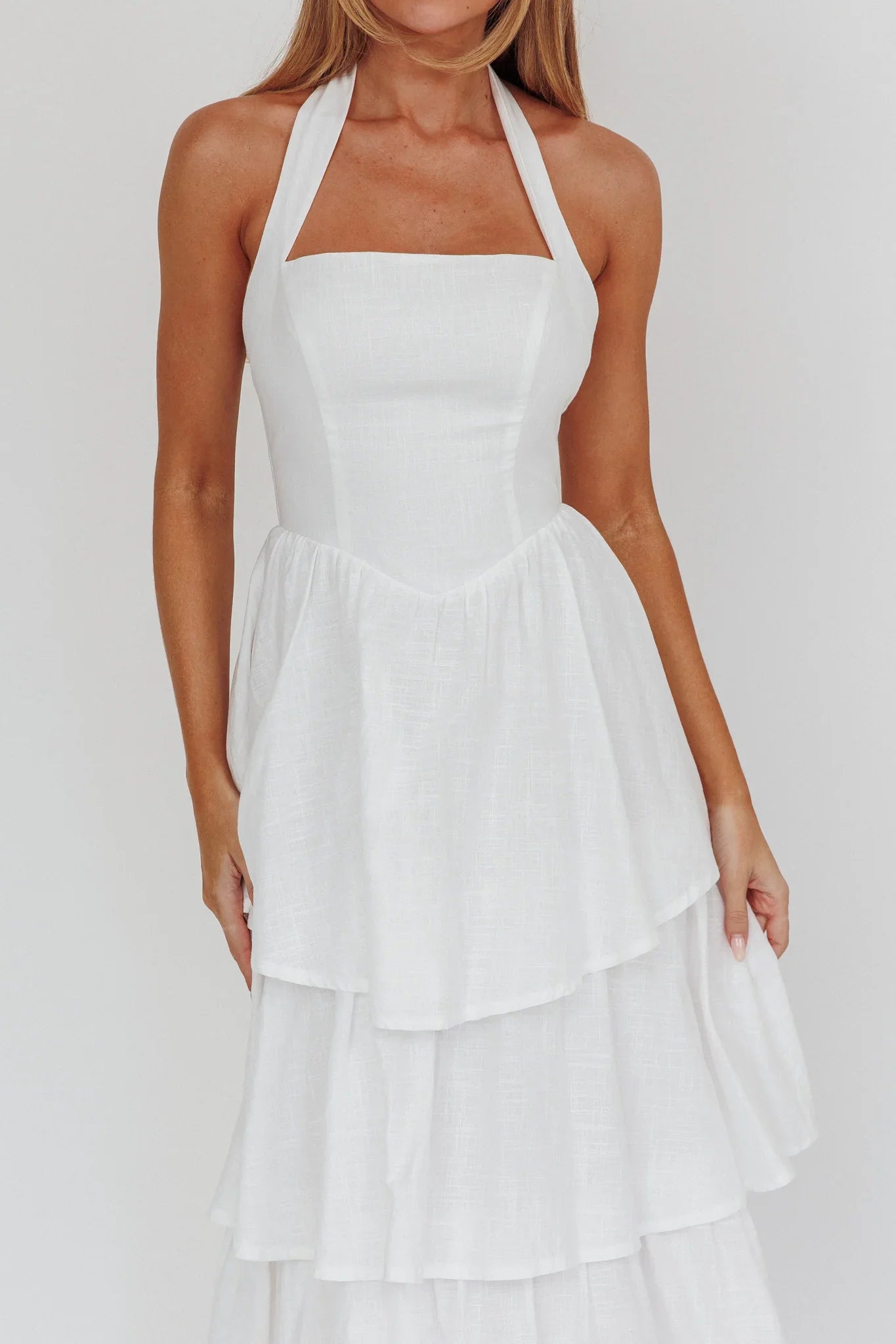 You will steal the spotlight in our gorgeous Shaya maxi dress. It features a halter neckline and a tiered ruffle design in the skirt. It's perfect for sunset cocktails with your girls teamed with strappy, nude heels and a purse for a head-turning look.