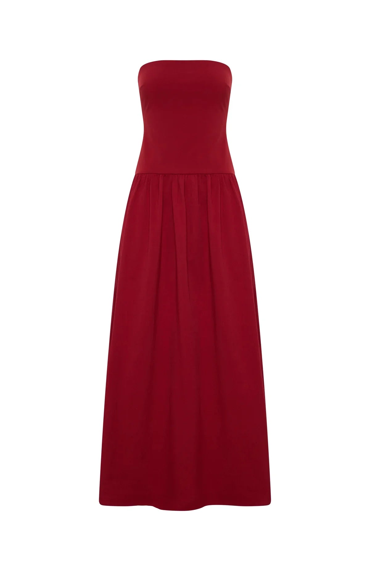 Make an entrance in the Take Back Maxi Dress Red. This strapless silhouette features secure grip tape detailing along the bust, a sleek invisible centre‑back zipper with clasp closure, and a fitted bodice that flows into a gathered skirt for graceful movement. Style with pointed‑toe heels and gold accessories to channel that timeless, holiday vibe.