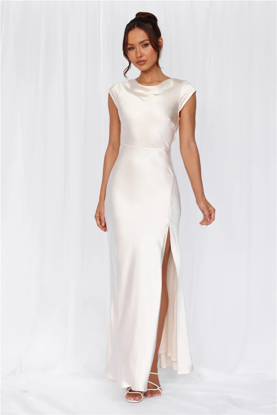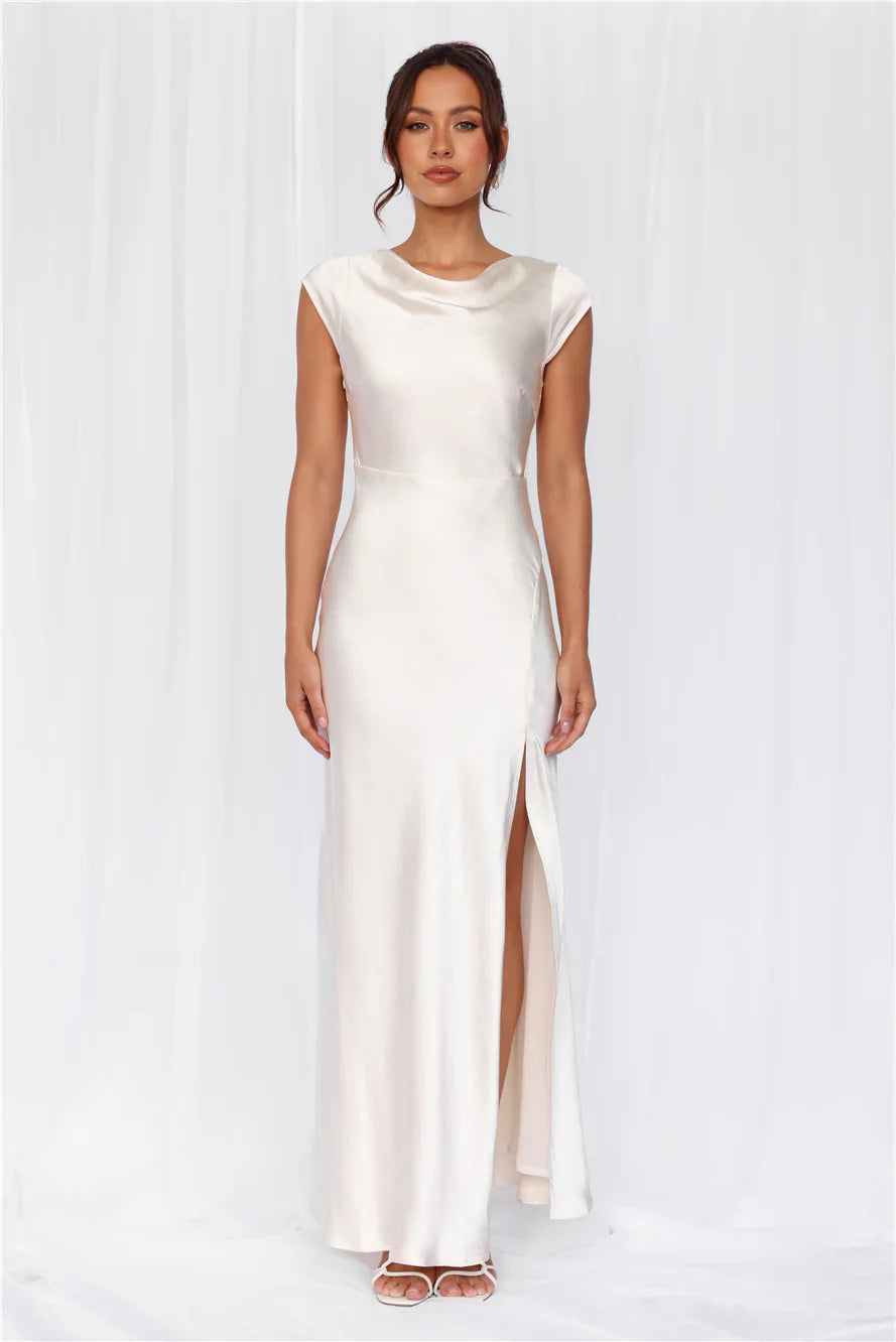 Introducing a captivating style, designed with a high cowl neckline and delicate cap sleeves, evoking timeless elegance and femininity. The tie-back feature adds a charming touch, while the twist back with a subtle cutout detail adds a modern flair, perfect for a bridesmaid ensemble that exudes both sophistication and contemporary style.