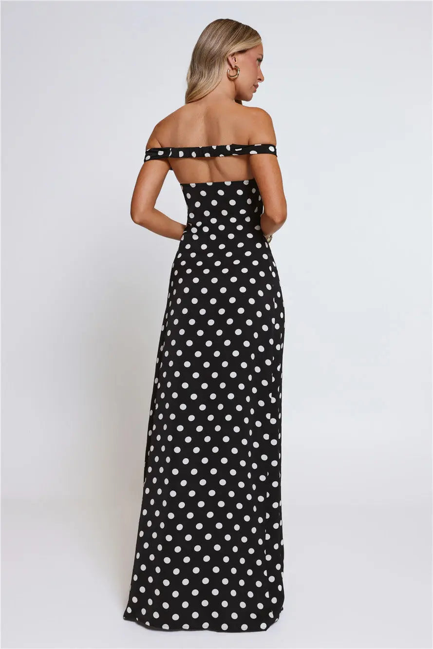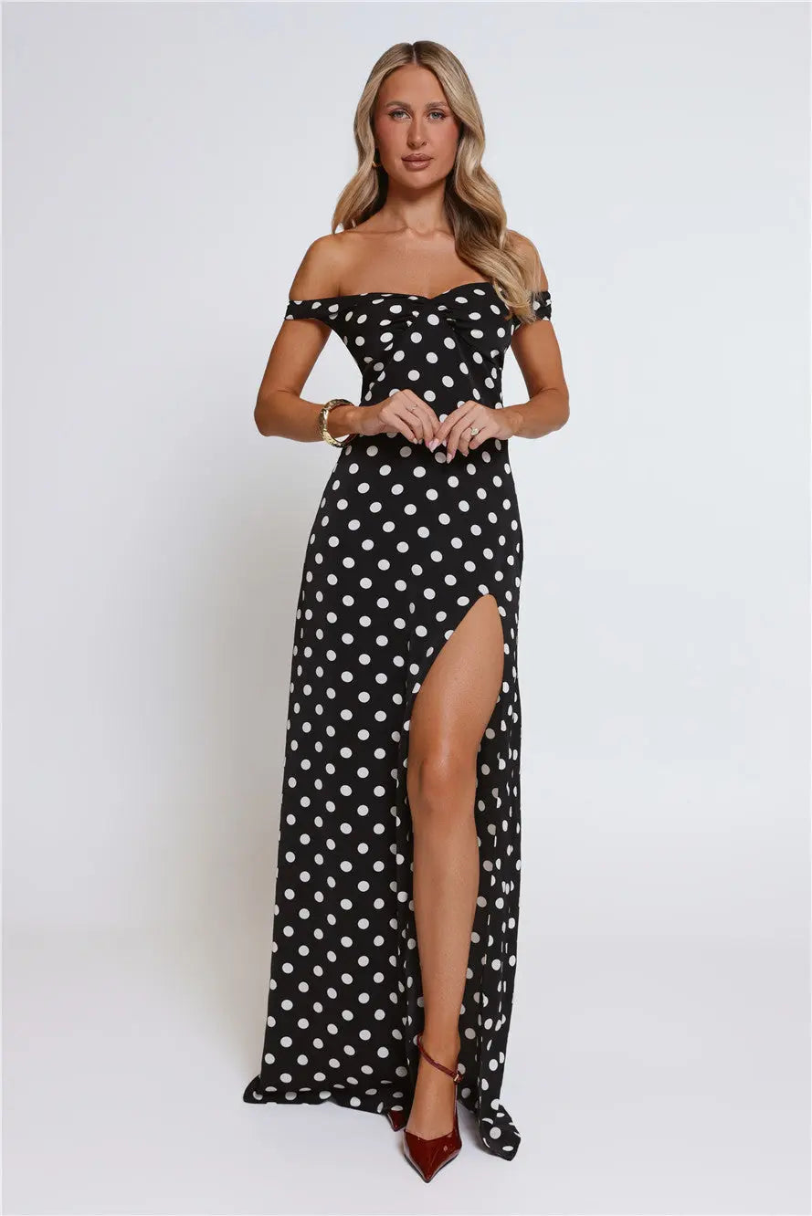Effortlessly elegant, the Trending Live Off Shoulder Polka Dot Maxi Dress features a timeless off-shoulder neckline and a sleek straight skirt with a subtle side split. Designed in a playful polka dot print, this piece perfectly balances classic charm with modern sophistication—ideal for special occasions or evening events.