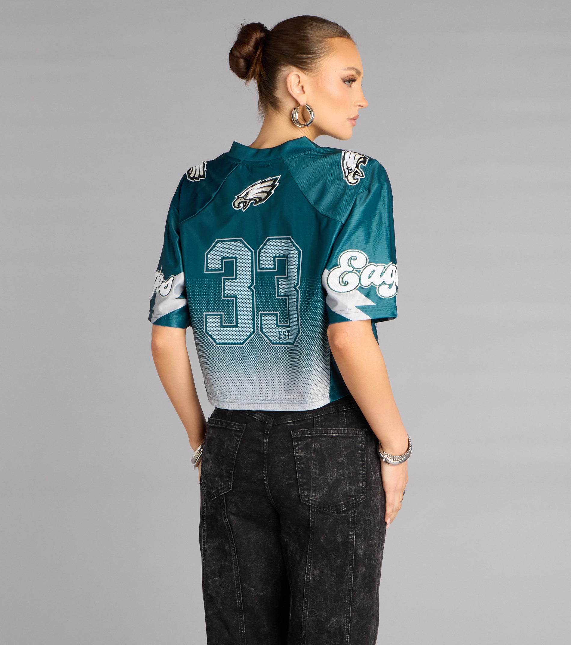For the fan who doesn’t just show up—she shows out. This Eagles jersey crop top brings bold graphics, a gradient finish, and that classic team energy that instantly levels up your game-day look.