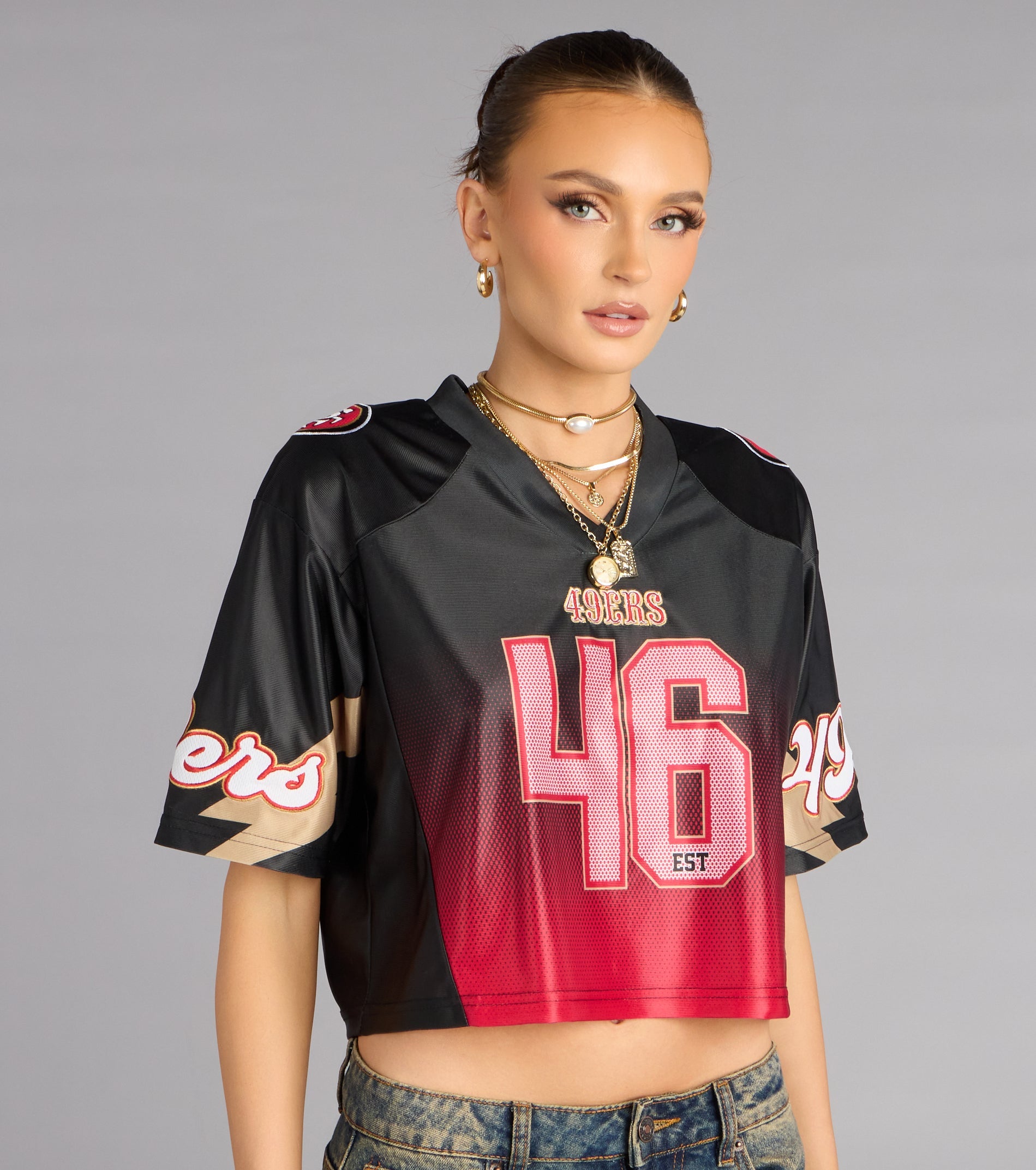 For the fan who doesn’t just show up—she shows out. This 49ers mesh top brings bold graphics, a gradient finish, and that classic team energy that instantly levels up your game-day look.