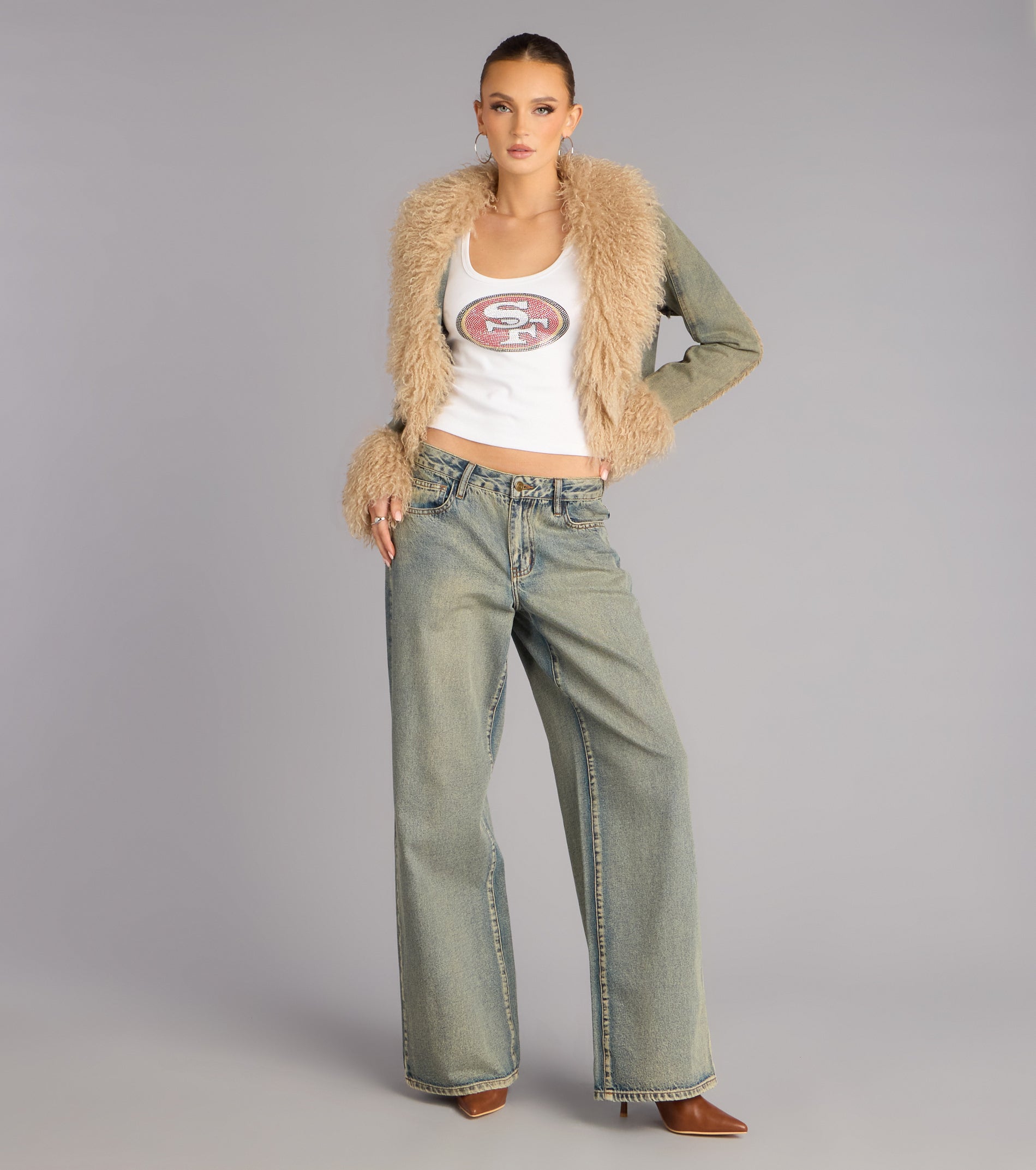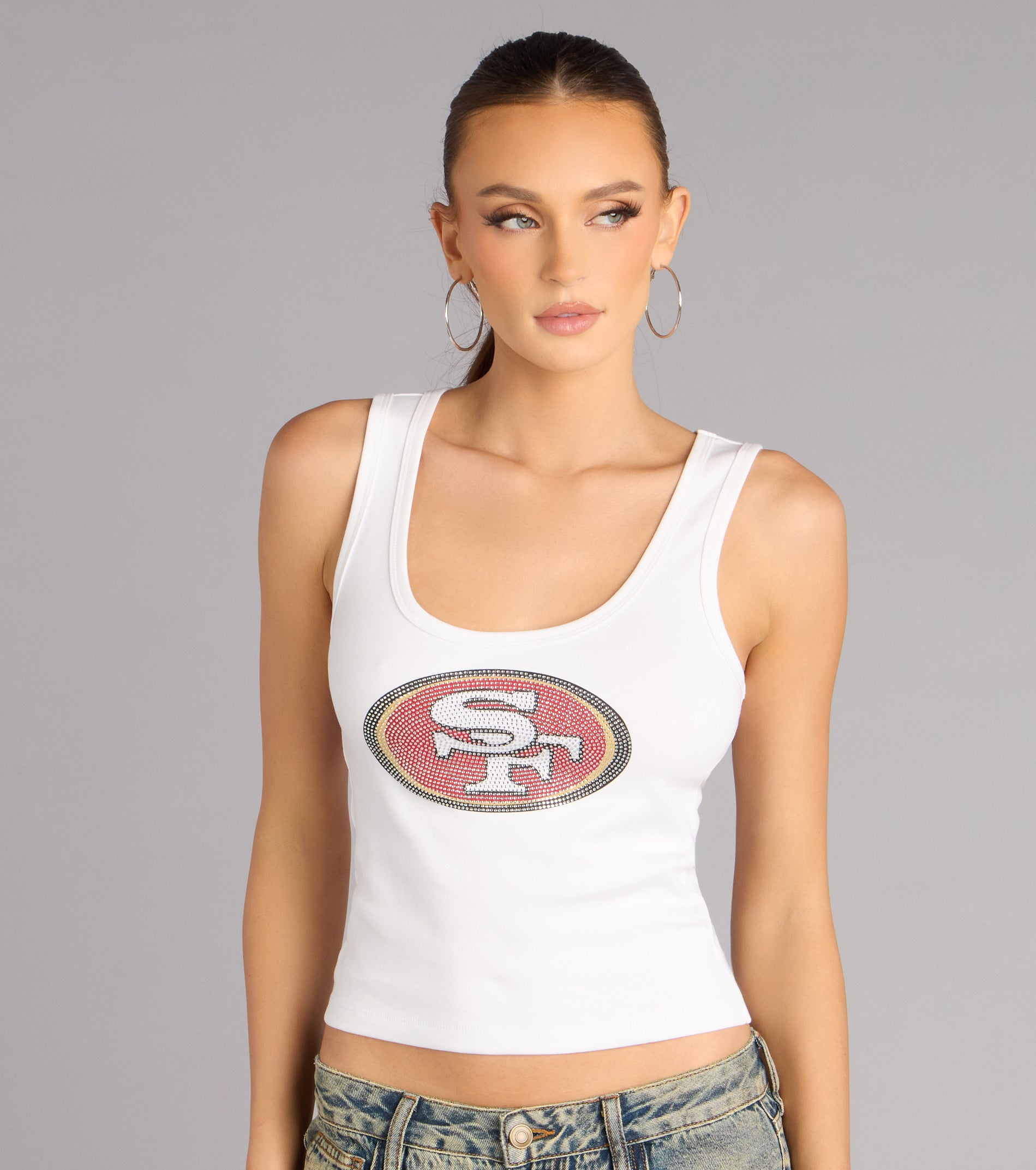 When your game-day 'fit needs a little sparkle, this tank top shows up ready to cheer with you. The fitted, stretchy feel and rhinestone San Francisco 49ers graphic make it perfect for tailgates, nights out, or any moment you want your team pride to shine.