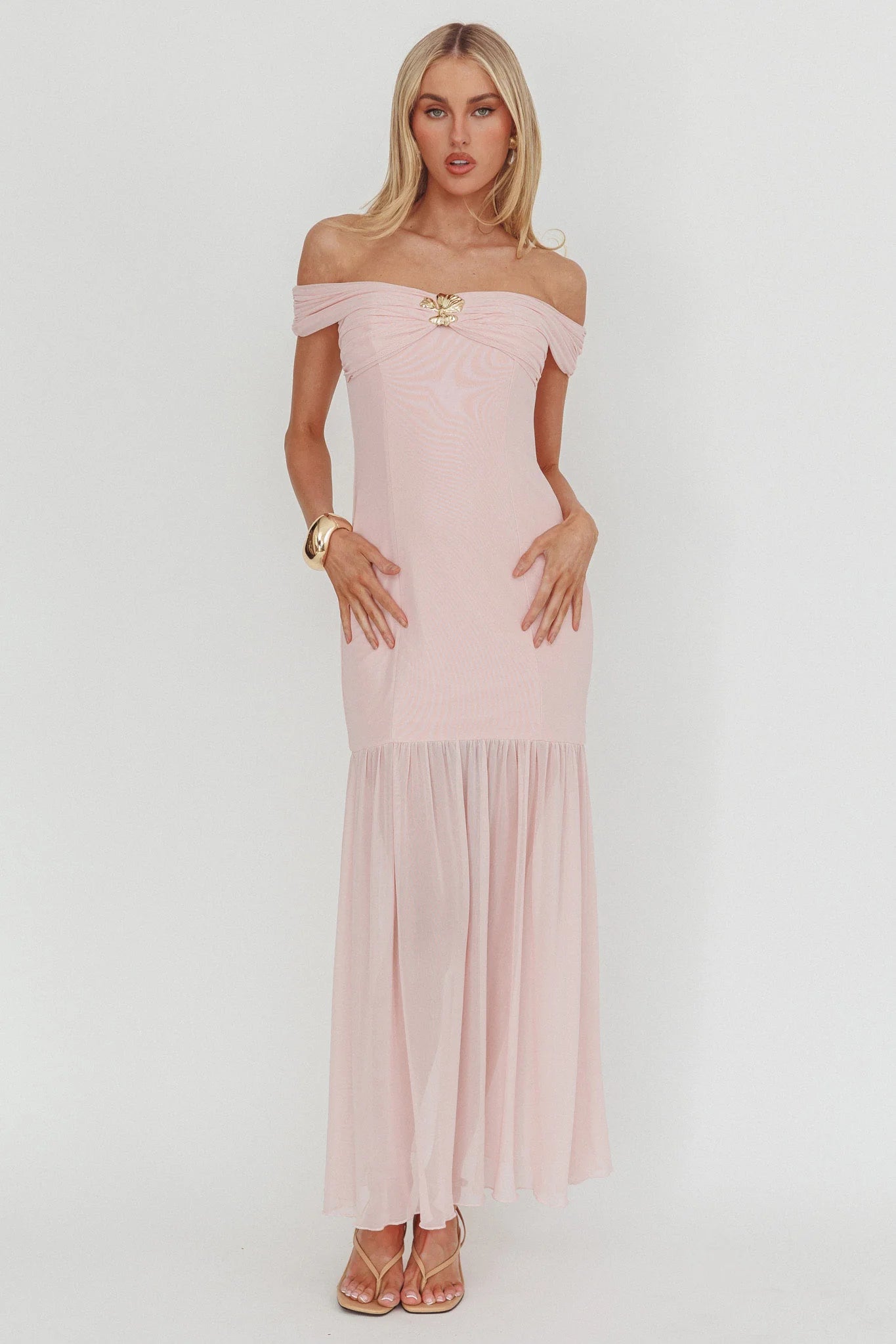 Twirl the night away in our stunning Wilma midi dress. It features a gorgeous sheer hem and a classic off-shoulder design. It's perfect for a wedding or special event. Team it with strappy heels, a sleek bun and a clutch for an It Girl look.